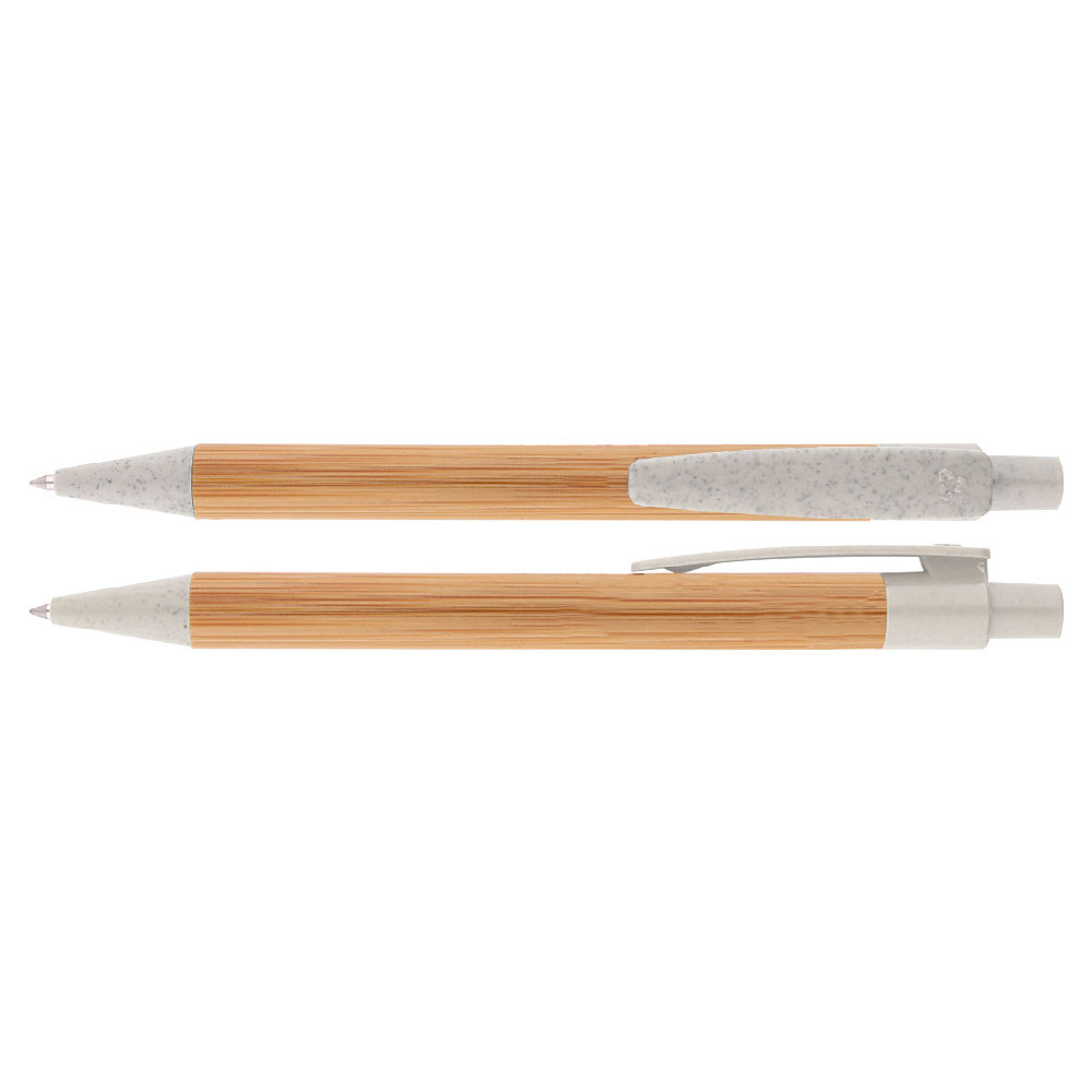 Kuličkové pero je vyrobeno z ekologicky šetrných materiálů - tělo je z přírodního bambusu a klip s koncovkami ze směsi 50% plastu a zbytek přírodní slámy.