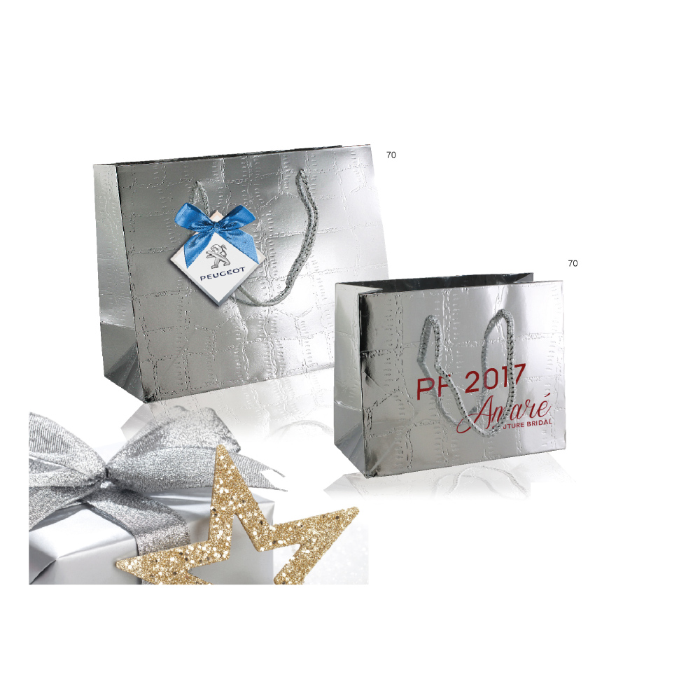 Papírová taška v luxusním stříbrném designu s bavlněnými držadly a kartonem na dněRozměry: 140 x 110 x 65 mmMinimální odběr: 1 ks