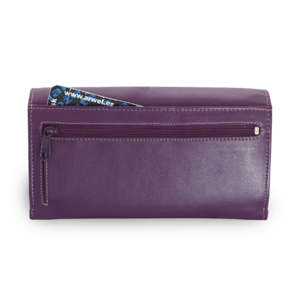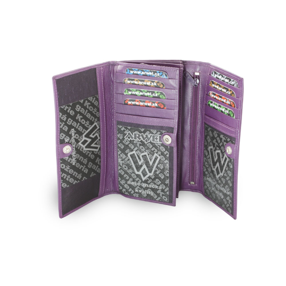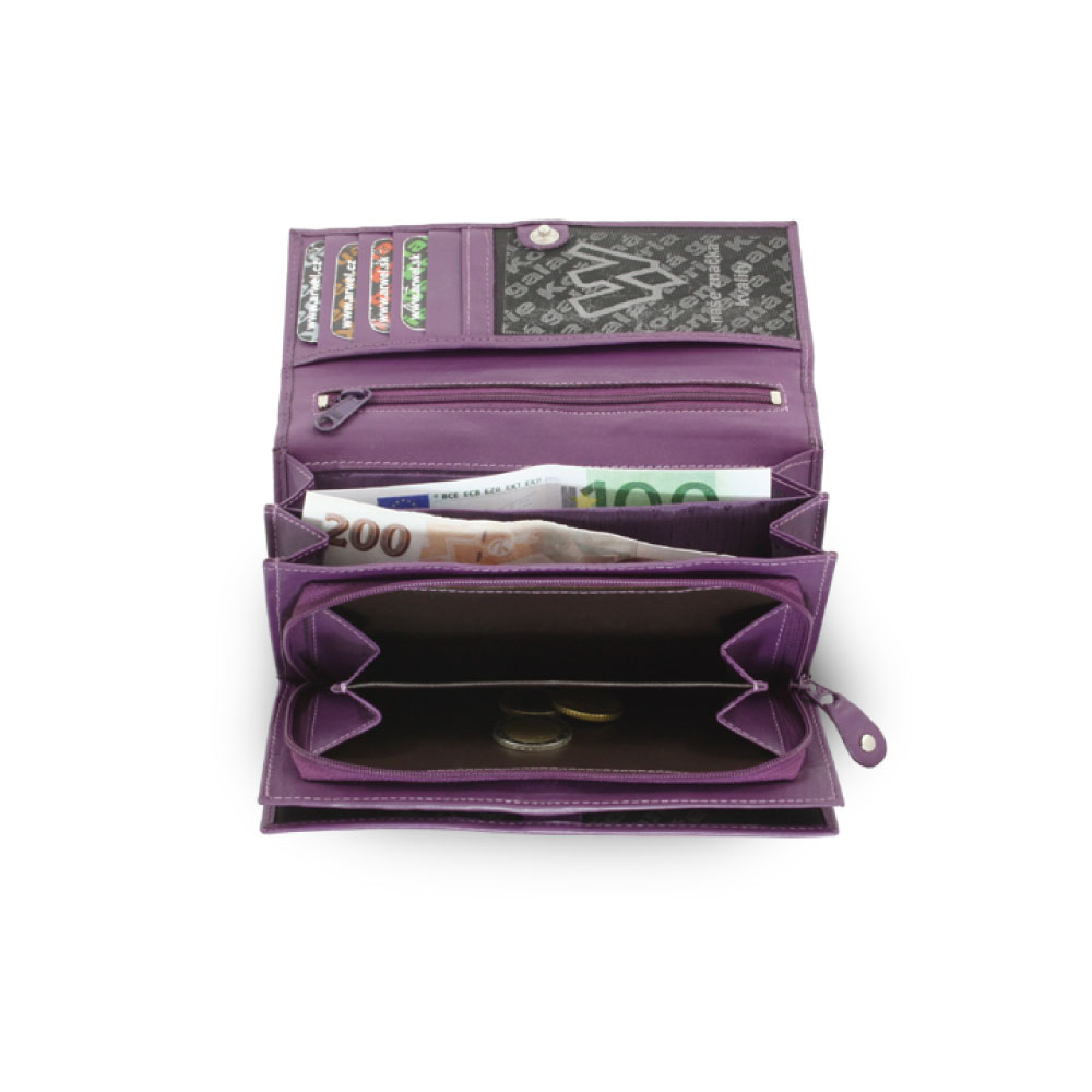2 přihrádky na bankovky + 1 zdvojená zipová kapsa na mince, 8 kapes na kreditní karty, 3 průhledné kapsy, 1 vnitřní a 1 zipová kapsa, 1 zipová a 1 otevřená zadní kapsa.Základní rozměr 9,5 x 18 cm.Materiál NDM, barva fialová.