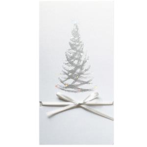 Bílý perleťový papír zdobený stříbrným vánočním stromem a dekorativní mašličkou.