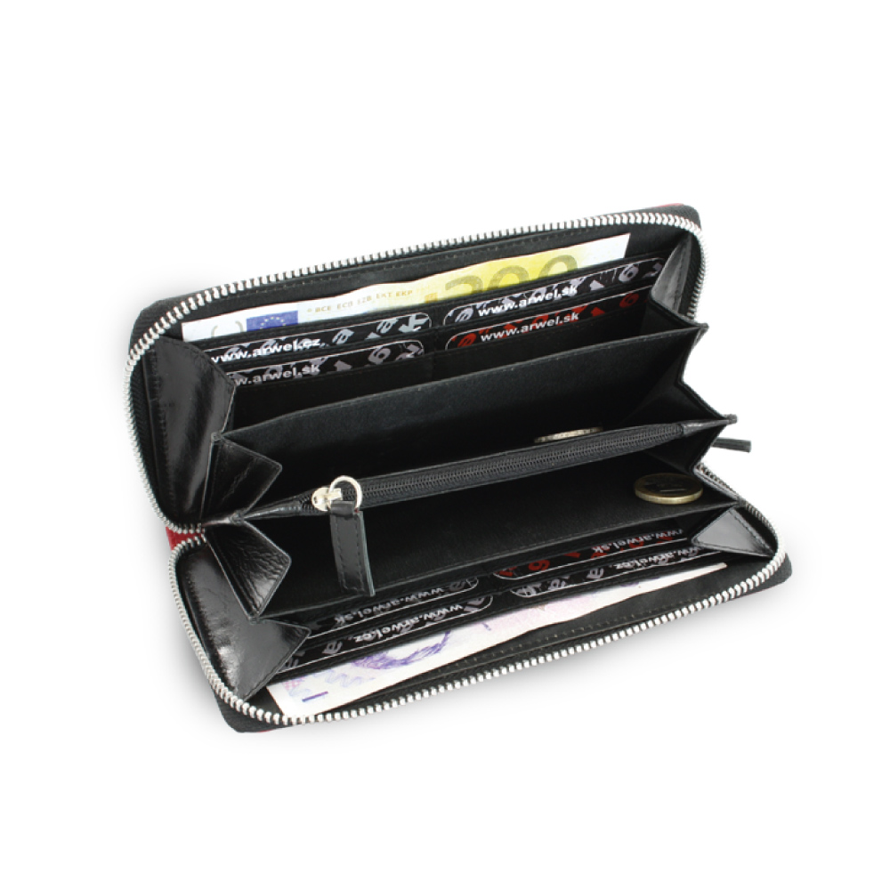 2 přihrádky na bankovky a další 2 přihrádky, do kterých lze vložit mobilní telefon až do velikosti 5,5 palce nebo bankovky, zipová kapsa na mince, 12 kapes na kreditní karty, občanský průkaz nebo řidičský průkaz, kovový hlavní zip. Základní rozměr 20 x 11 cm.