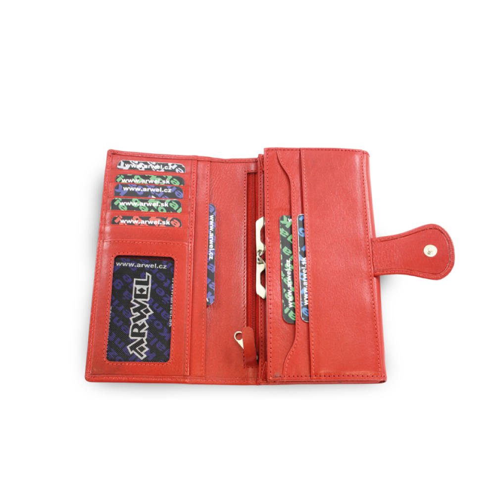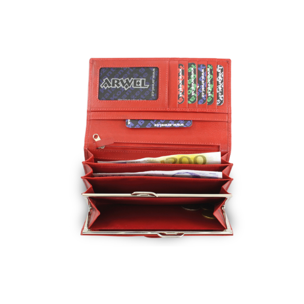 3 přihrádky na bankovky, rámová kapsa na mince, 10 kapes na kreditní karty, občanský průkaz nebo řidičský průkaz, vnitřní zipová kapsička, dvě velké vnitřní kapsy na dokumenty, venkovní zadní kapsa. Základní rozměr 18,5 x 10,5 cm.