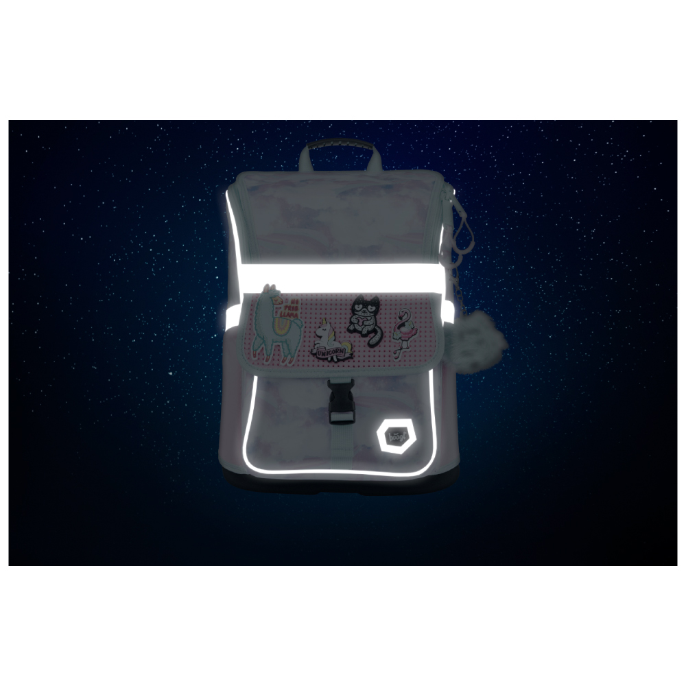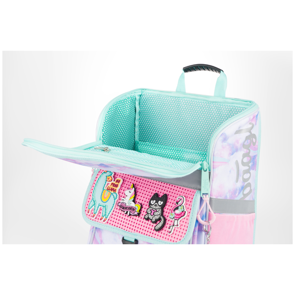 • Uvnitř aktovky je průhledná kapsa s rozvrhem a vnitřní organizér umožňující rovnoměrné rozložení hmotnosti, doplněný gumičkou pro fixaci.