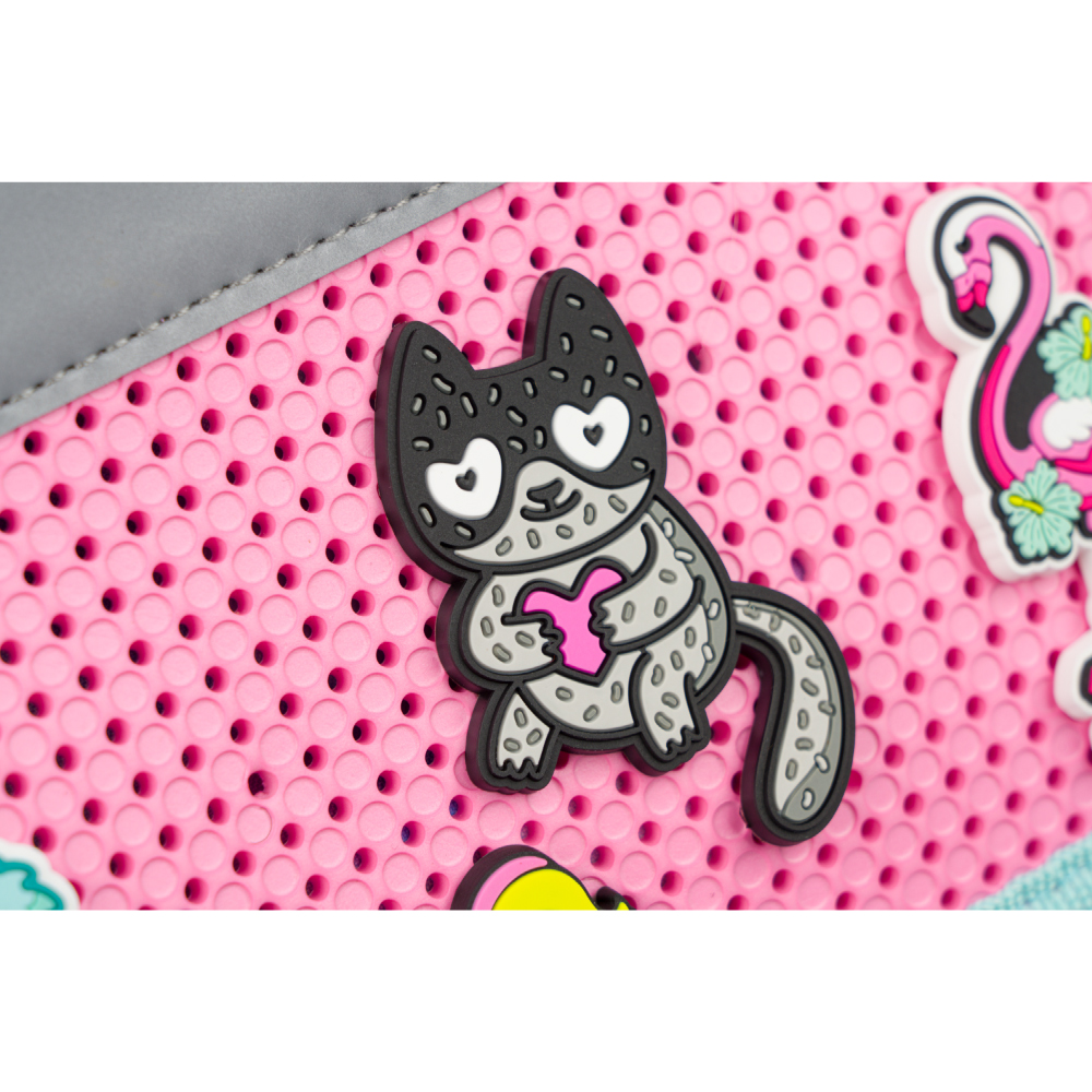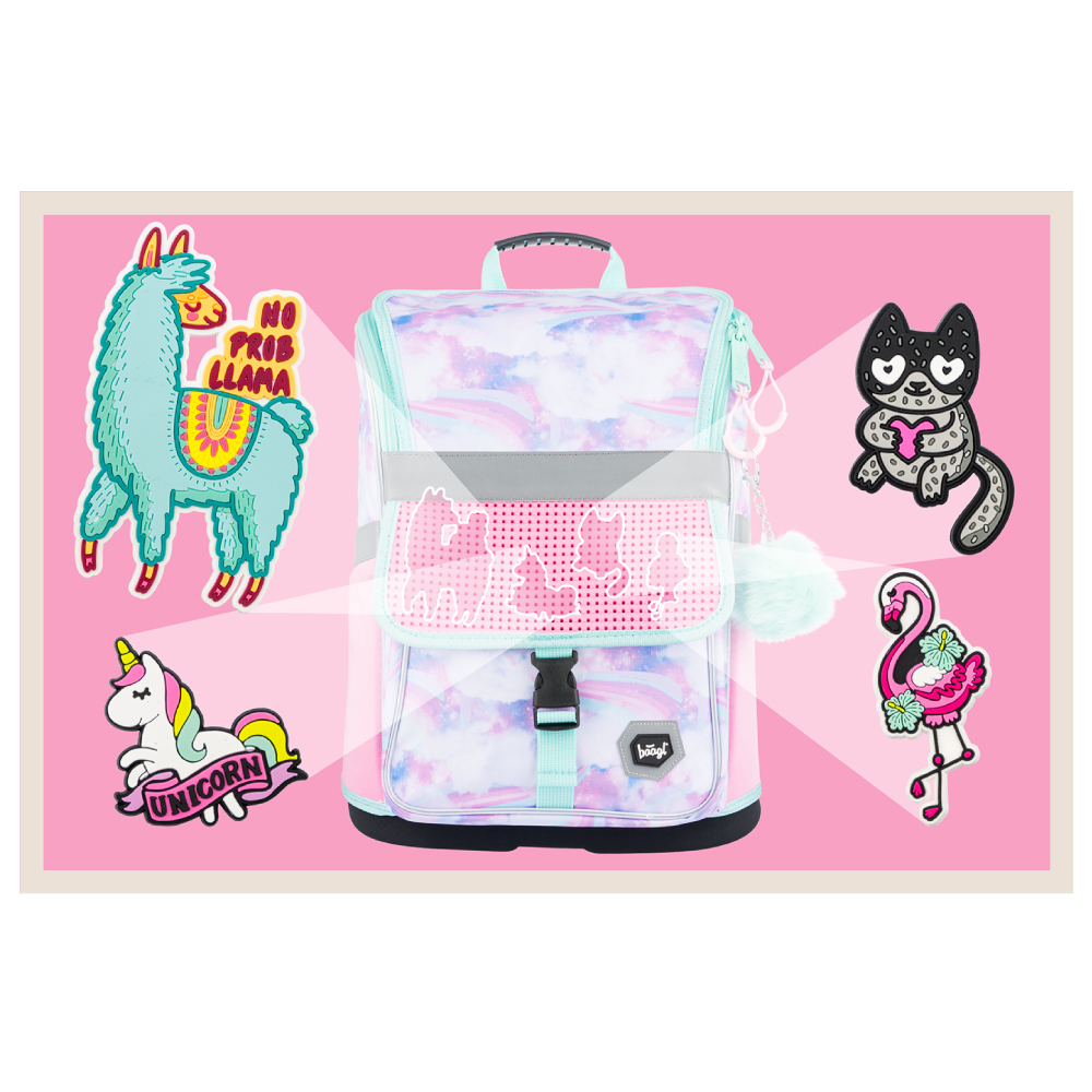 • Na klopu přední kapsy můžete libovolně připevňovat odznáčky, které jsou k aktovce jako dárek.