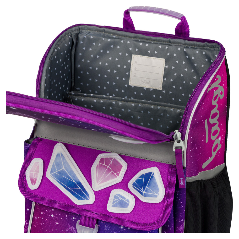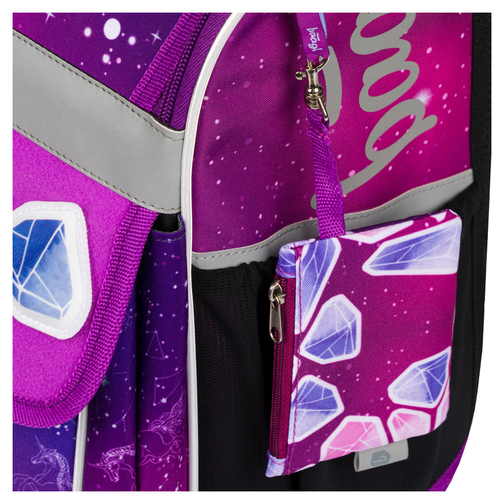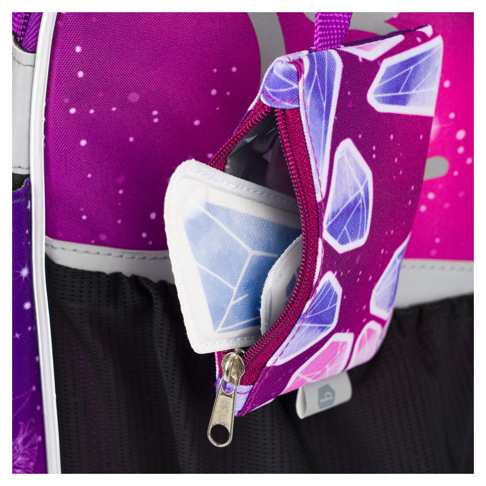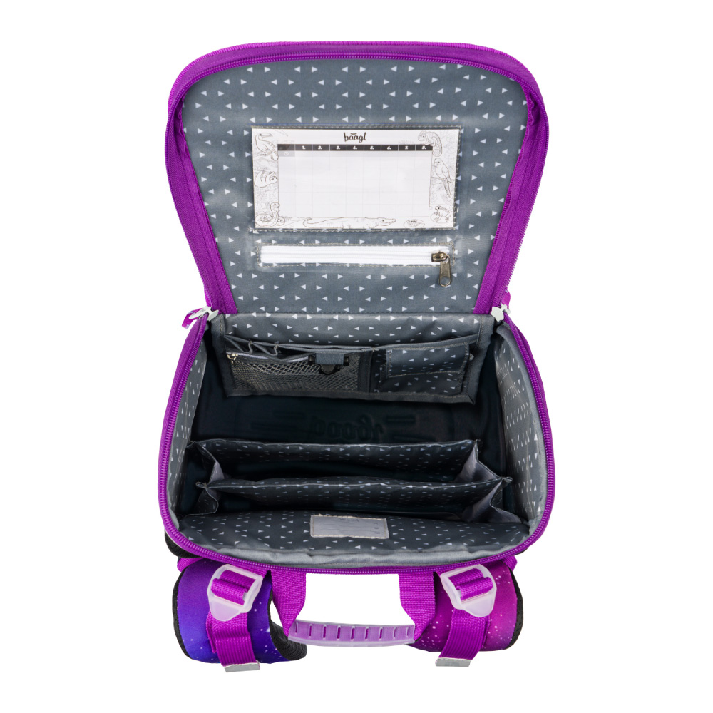 • Uvnitř aktovky je průhledná kapsa s rozvrhem a vnitřní organizér umožňující rovnoměrné rozložení hmotnosti, doplněný gumičkou pro fixaci.