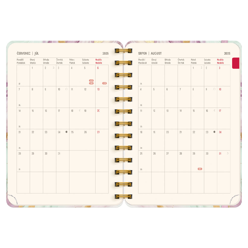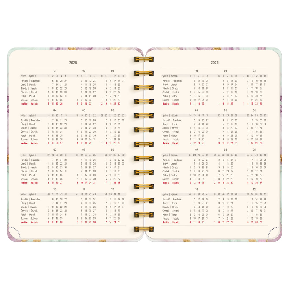 Rozměr: 13 x 18 cm Formát: B6 Počet stran: 192 Kalendárium: týdenní 18 měsíční 2 jazyčné (CZ, SK) - od července 2025 do prosince 2026 Papír: krémový Vazba: dvojitá spirála