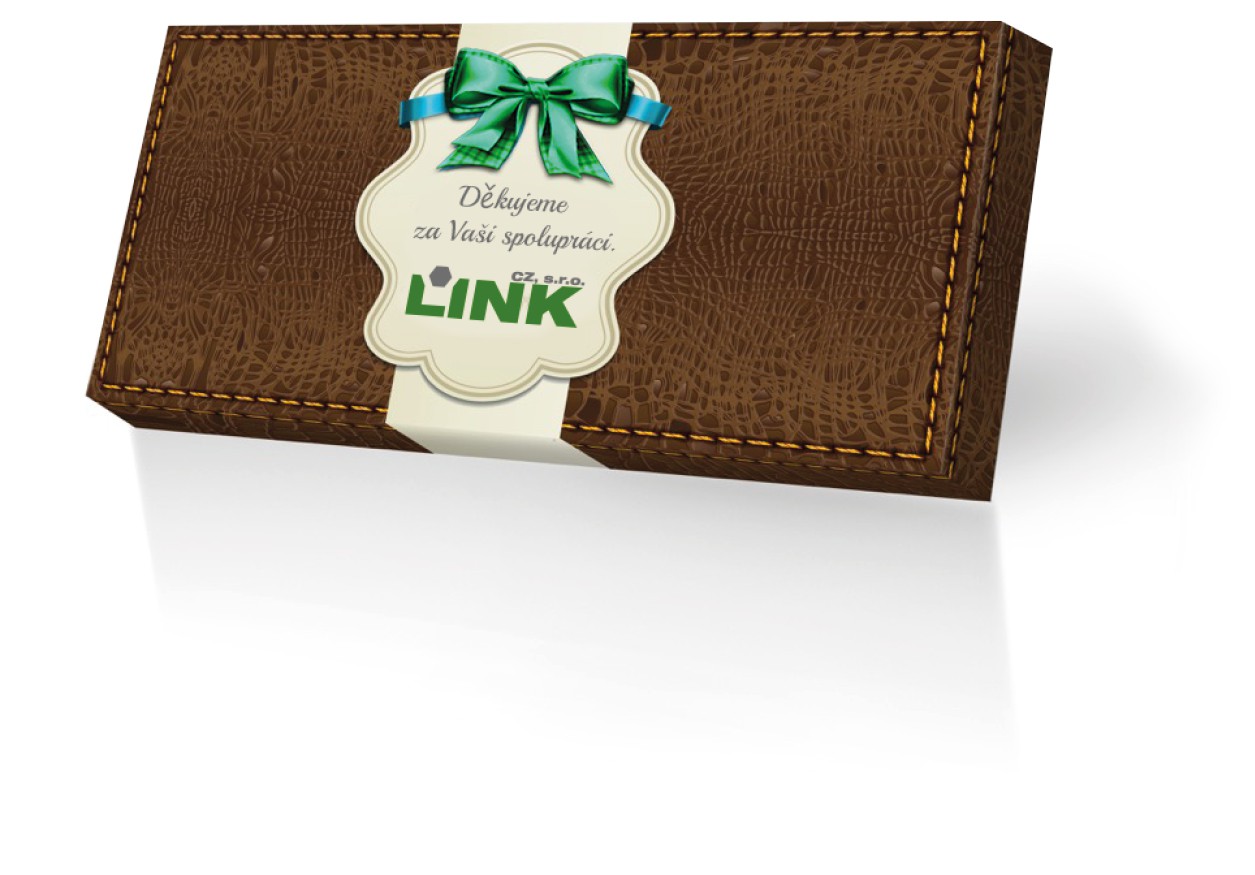 Bonboniéra z pralinek plněných hořkou a mléčnou čokoládou v papírové krabici v imitaci kůže s možností návleku s vlastním logem