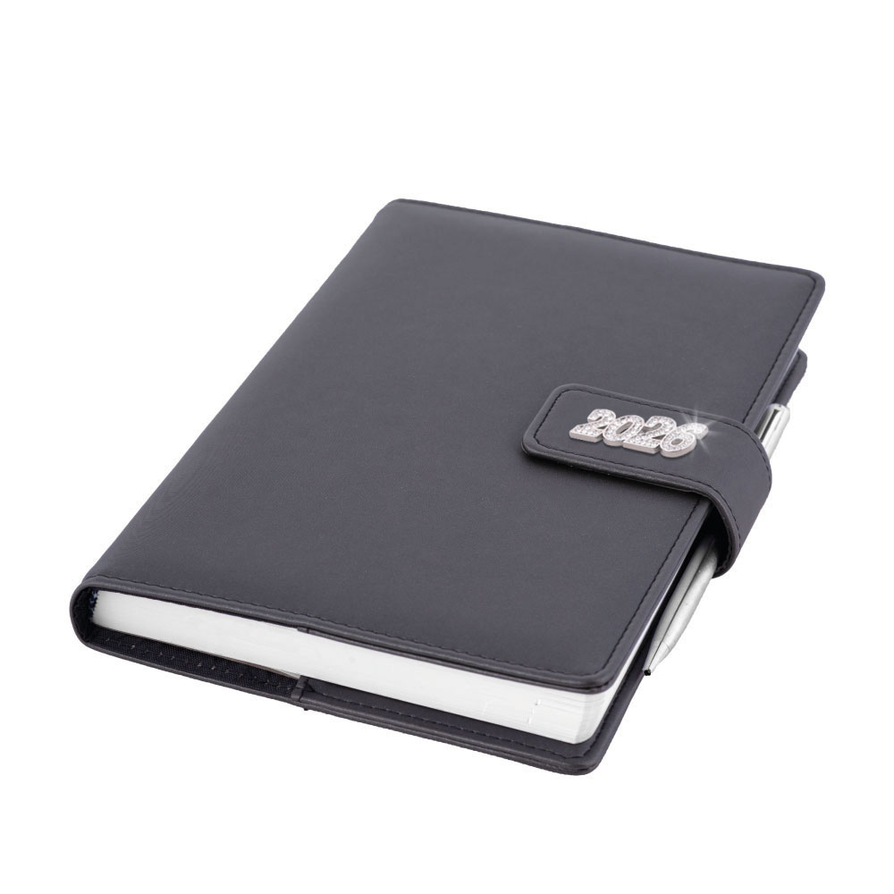 Tagebuch enthält: runde Abreißecken, weißes Lesezeichen, Kuli und Magnetverschluss