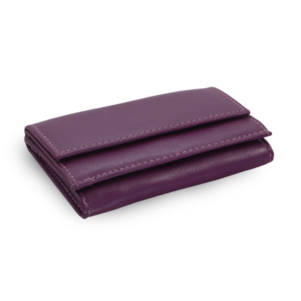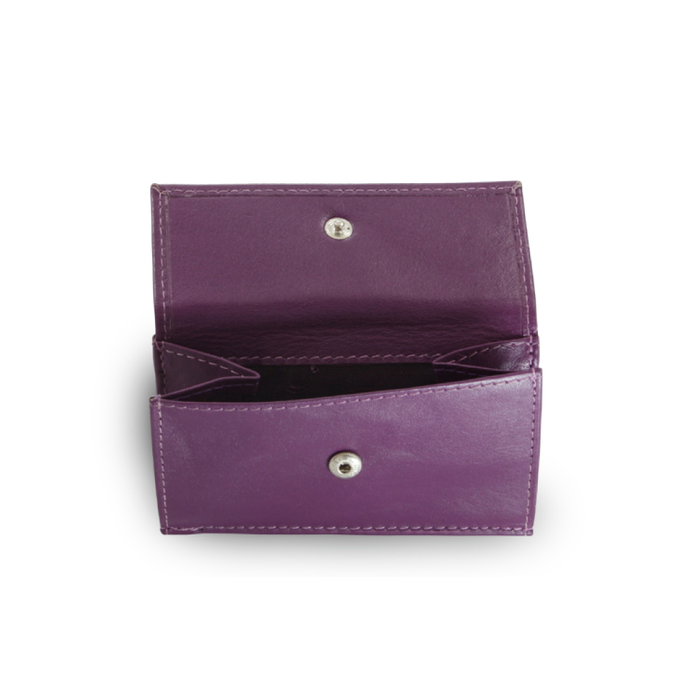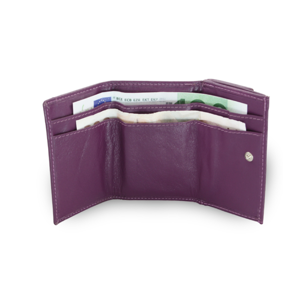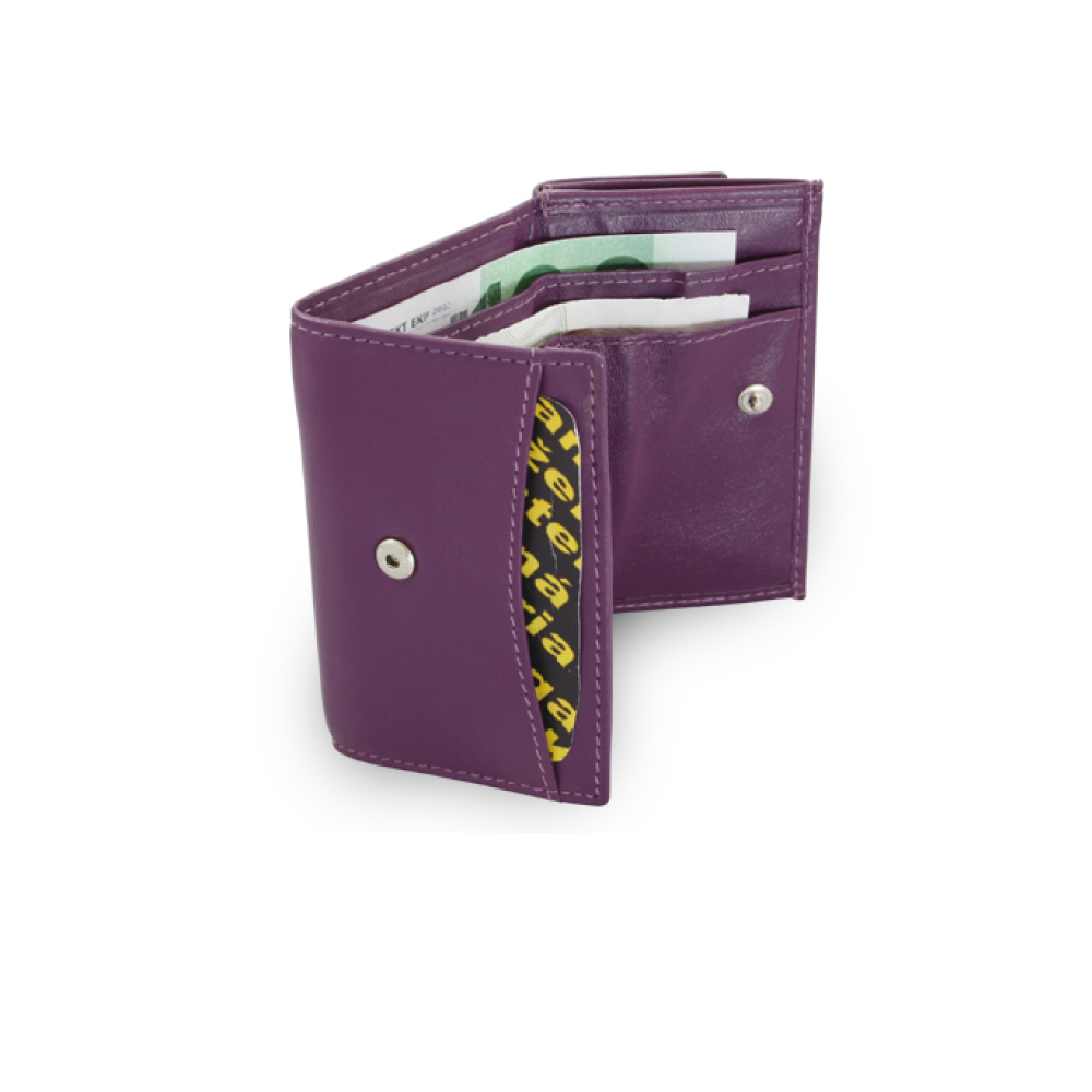 6 přihrádky na bankovky a rámová dvoukapsa na mince, 9 kapes na kreditní karty, 2 kapsy na doklady.Základní rozměr 10 x 11,5 cm.Materiál SVG, barva tmavě fialová.