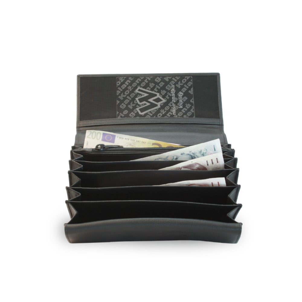 Popis:  7 přihrádek na bankovky, 1 zipová a 1 klopnová přední kapsa na mince, 1 průhledná kapsa, kapsa na zadní straně
