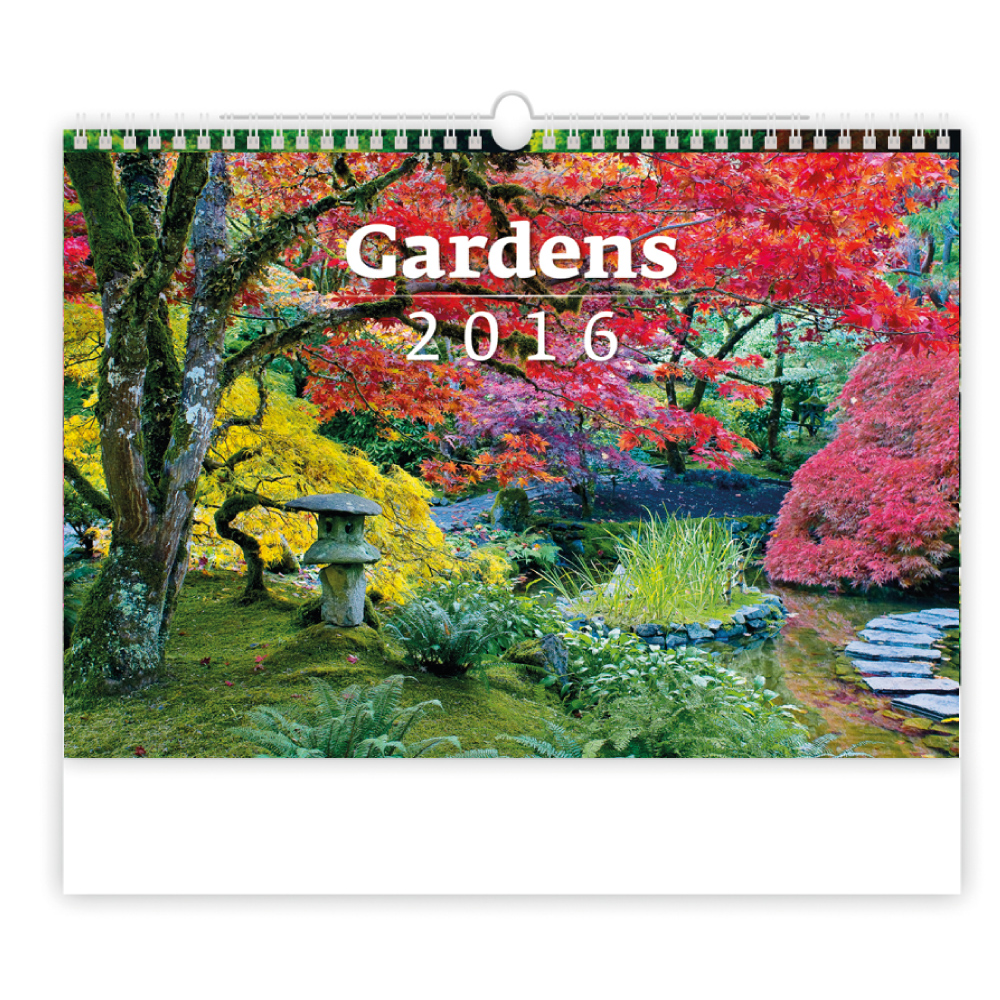 Nástěnný kalendář Gardens 2016 rozměr - 45 x 31,5 cm kalendárium - měsíční mezinárodní rozsah kalendáře - 14 stran vazba: dvojitá spirála plocha pro potisk - 45 x 7 cm