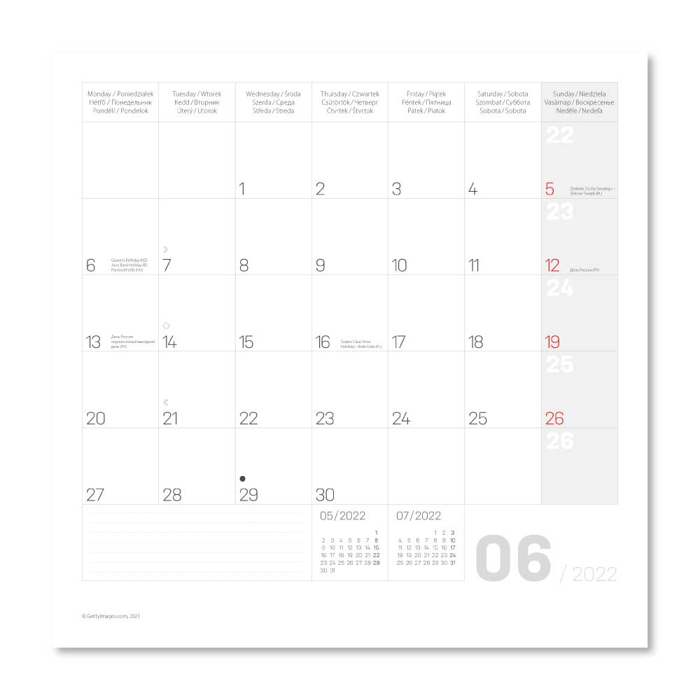 Rozměr: 30 x 30 cm (otevřený 30 x 60 cm)Kalendárium: 16 měsíční kalendář, 6jazyčné (CZ, SK, PL, HU, EN, RU)Rozsah kalendáře: 14 stranVazba: šitá V1