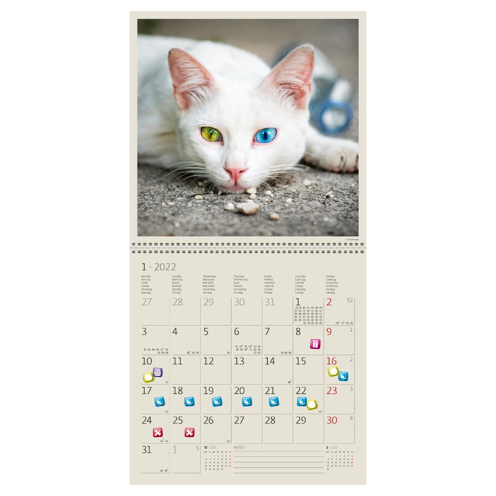 Rozměr: 30 x 30 cm (otevřený 30 x 60 cm) Kalendárium: mezinárodní měsíční se svátky 40 zemí Rozsah kalendáře: 14 listů Obsahuje: samolepky na označování dnů