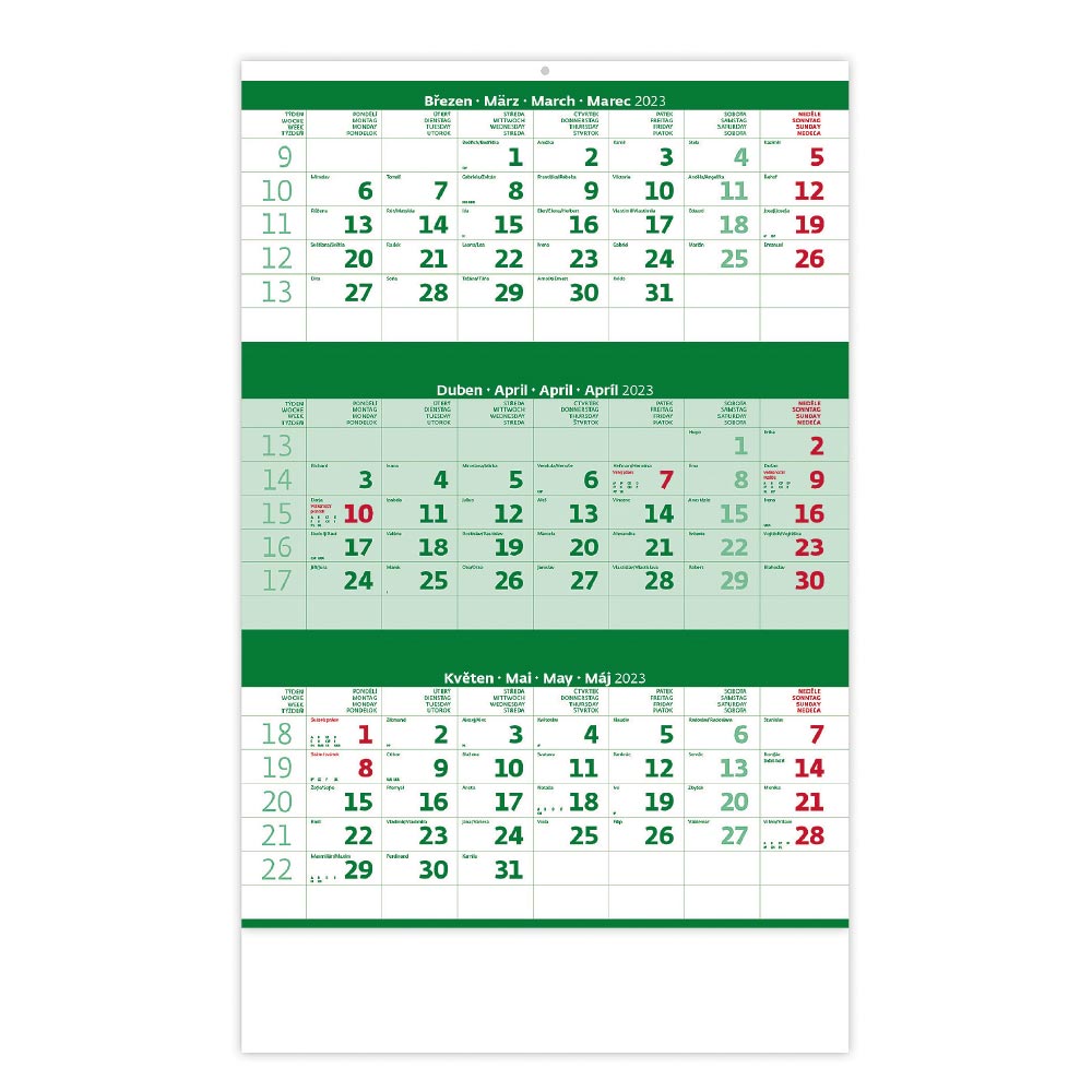 Rozměr: 31,5 x 45 cm Kalendárium: české tříměsíční jmenné se svátky vybraných evropských států Rozsah kalendáře: 12 listů Plocha pro potisk: 31,5 x 18 cm (horní našitá laš)