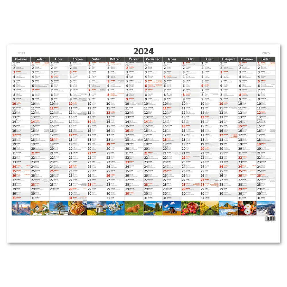 Rozměr: 88 x 64 cmKalendárium: české roční jmennéRozsah kalendáře: 1 listPlocha pro potisk: 88 x 7 cm