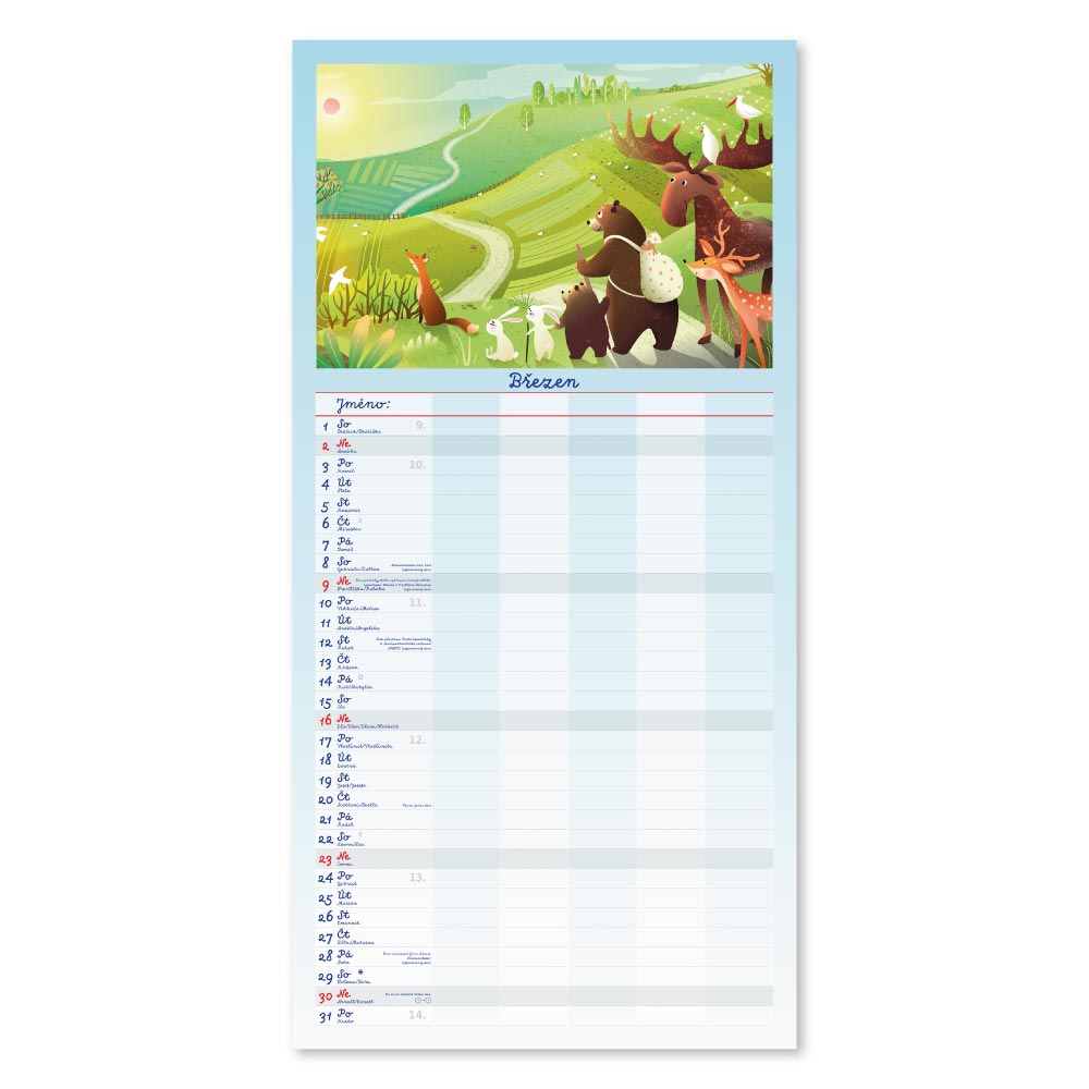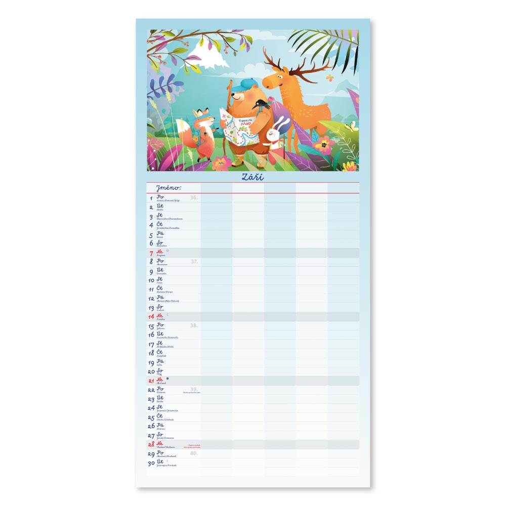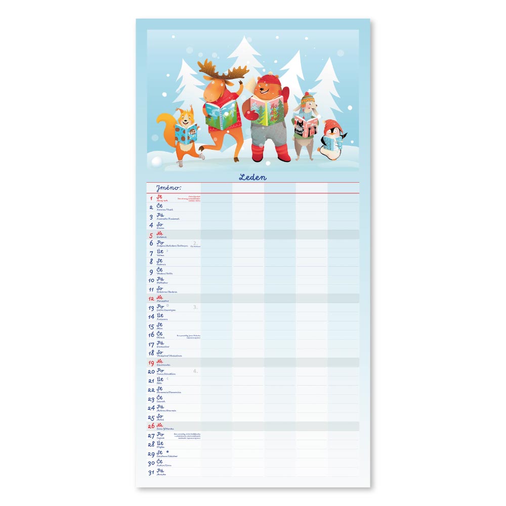Rozměr: 31,5 x 63 cmKalendárium: české měsíční jmennéVazba: Twin wireRozsah kalendáře: 14 listů