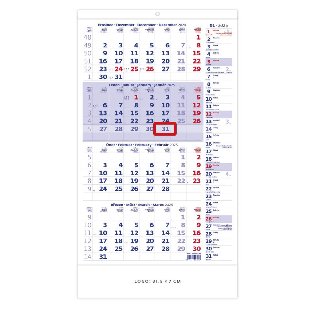 Rozměr: 31,5 x 49 cm Složený formát: 31,5 x 18,5 cm Kalendárium: CZ 4měsíční jmenné se svátky vybraných evropských států Rozsah kalendáře: 4 x 12 listů Plocha pro potisk: 31,5 x 3,5 cm (plochy mezi měsíce) 31,5 x 18 cm (horní plocha)