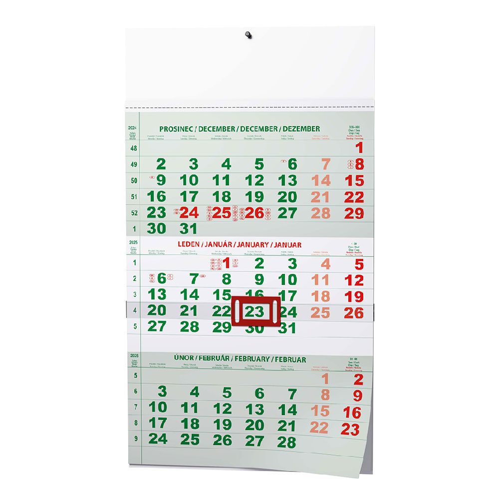 Rozměr: 292 x 420 mm Kalendárium: české tříměsíční s jazykovou mutací: CZ, SK, EN, DE Rozsah: 12 listů Mezinárodní svátky: CZ, SK, A, D, PL, H, GB, E, F, I, UA Plocha pro potisk: 292 x 85 mm