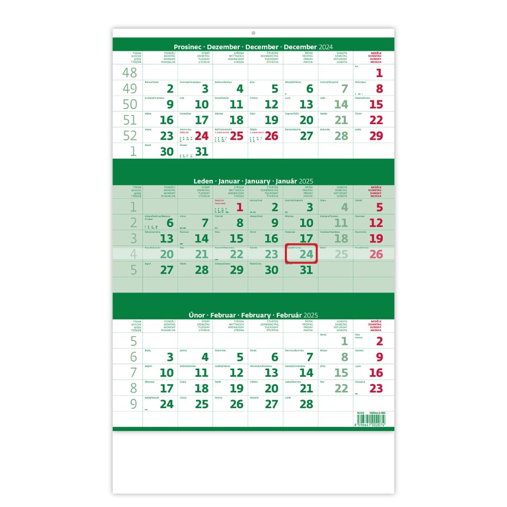 Rozměr: 31,5 x 45 cm Kalendárium: české tříměsíční jmenné se svátky vybraných evropských států Rozsah kalendáře: 12 listů Plocha pro potisk horní laše: 31,5 x 18 cm Plocha pro potisk: 31,5 x 7 cm