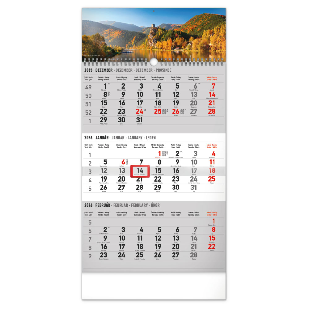 Rozměr: 29,5 x 43 cm (s horní lištou 29,5 x 60 cm) Kalendárium: 4jazyčné se slovenskými jmény (SK, CZ, GB, DE) Rozsah kalendáře: 12 listů Vazba: dvojitá spirála Gramáž papíru: 120 g/m2 Plocha pro potisk: prodloužená záda 29,5 x 6 cm