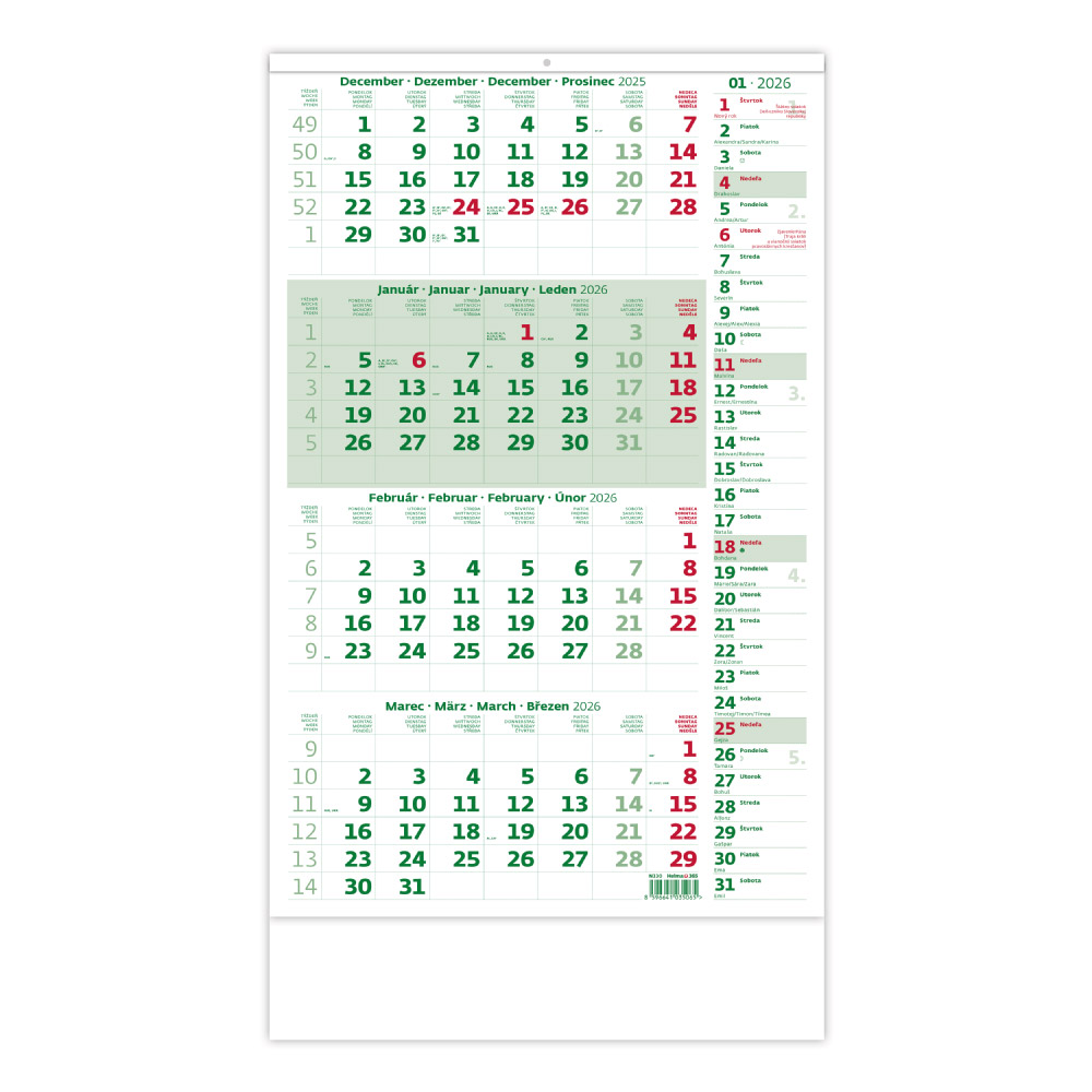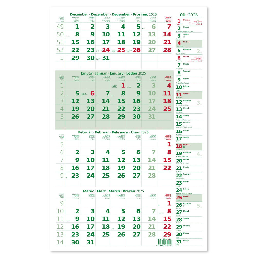 Rozměr: 31,5 x 49 cm Kalendárium: SK 4měsíční jmenné se svátky vybraných evropských států Rozsah kalendáře: 12 listů Plocha pro potisk: - 31,5 x 7 cm (spodní plocha) - 31,5 x 18 cm (horní plocha)