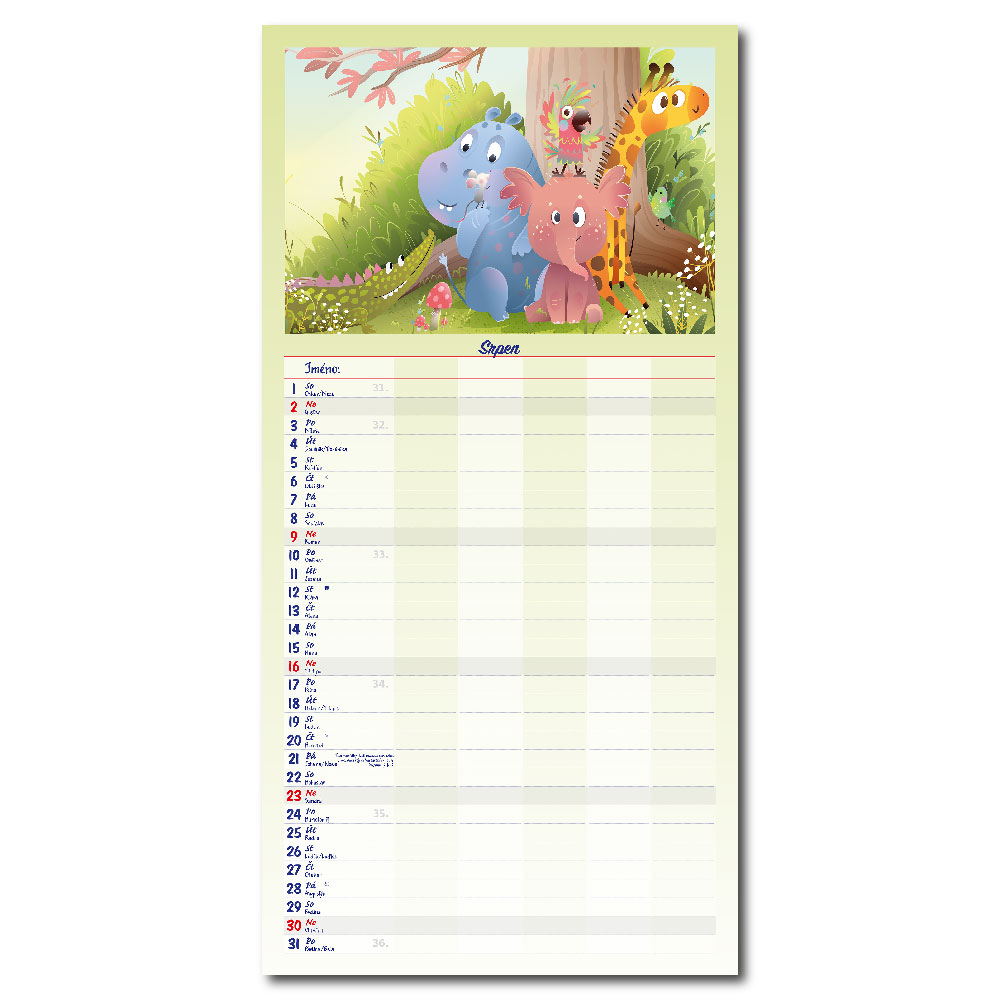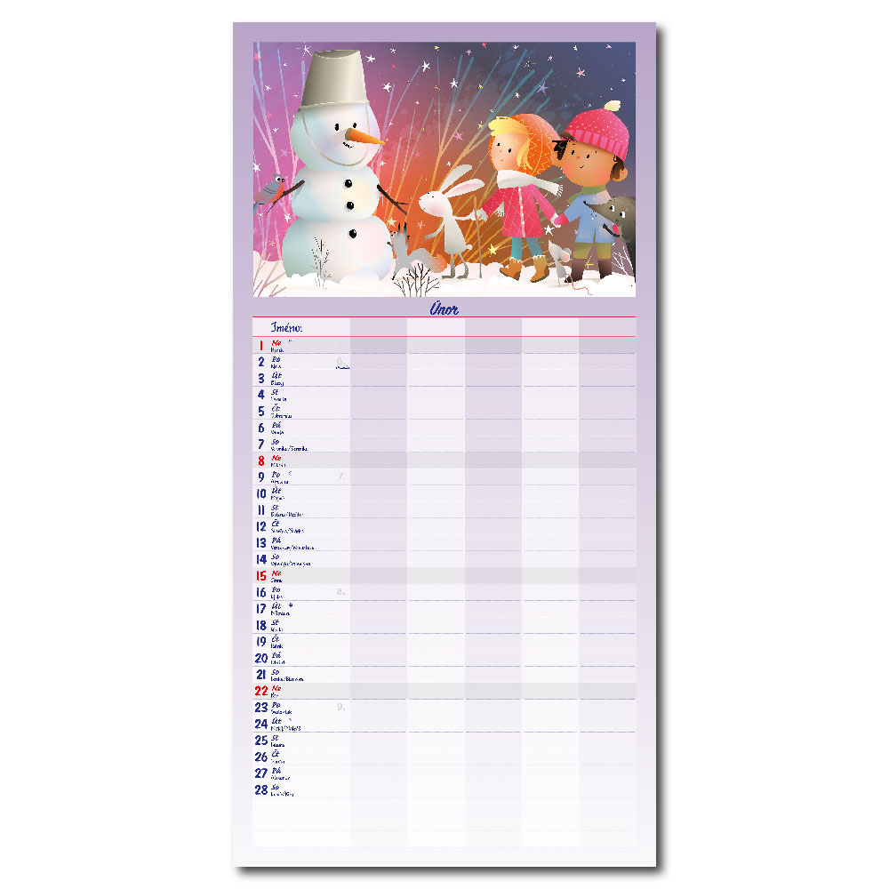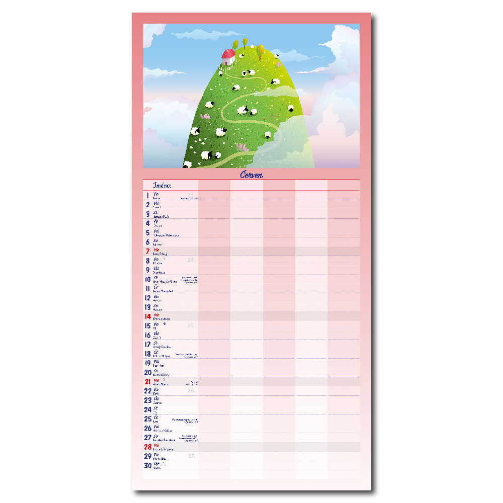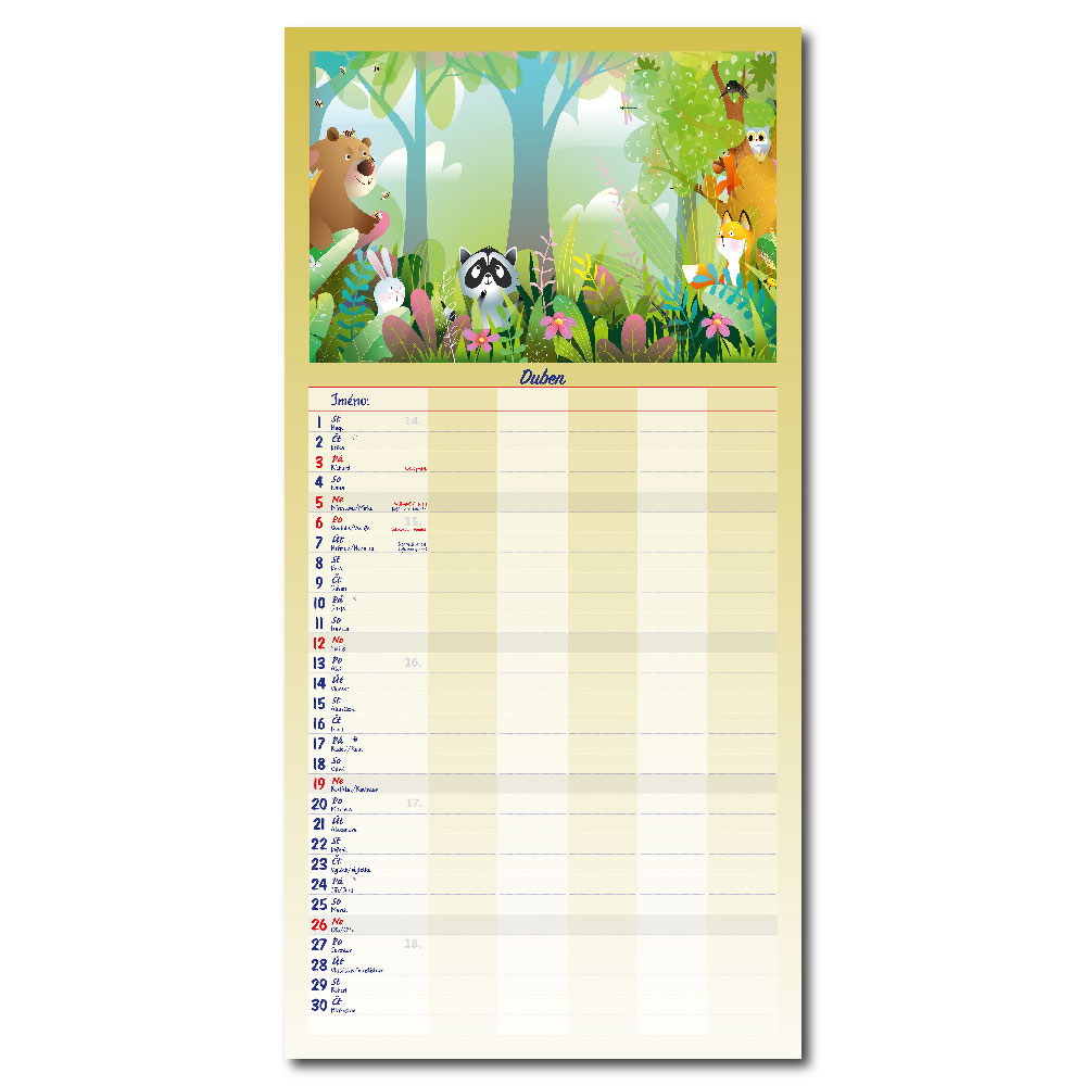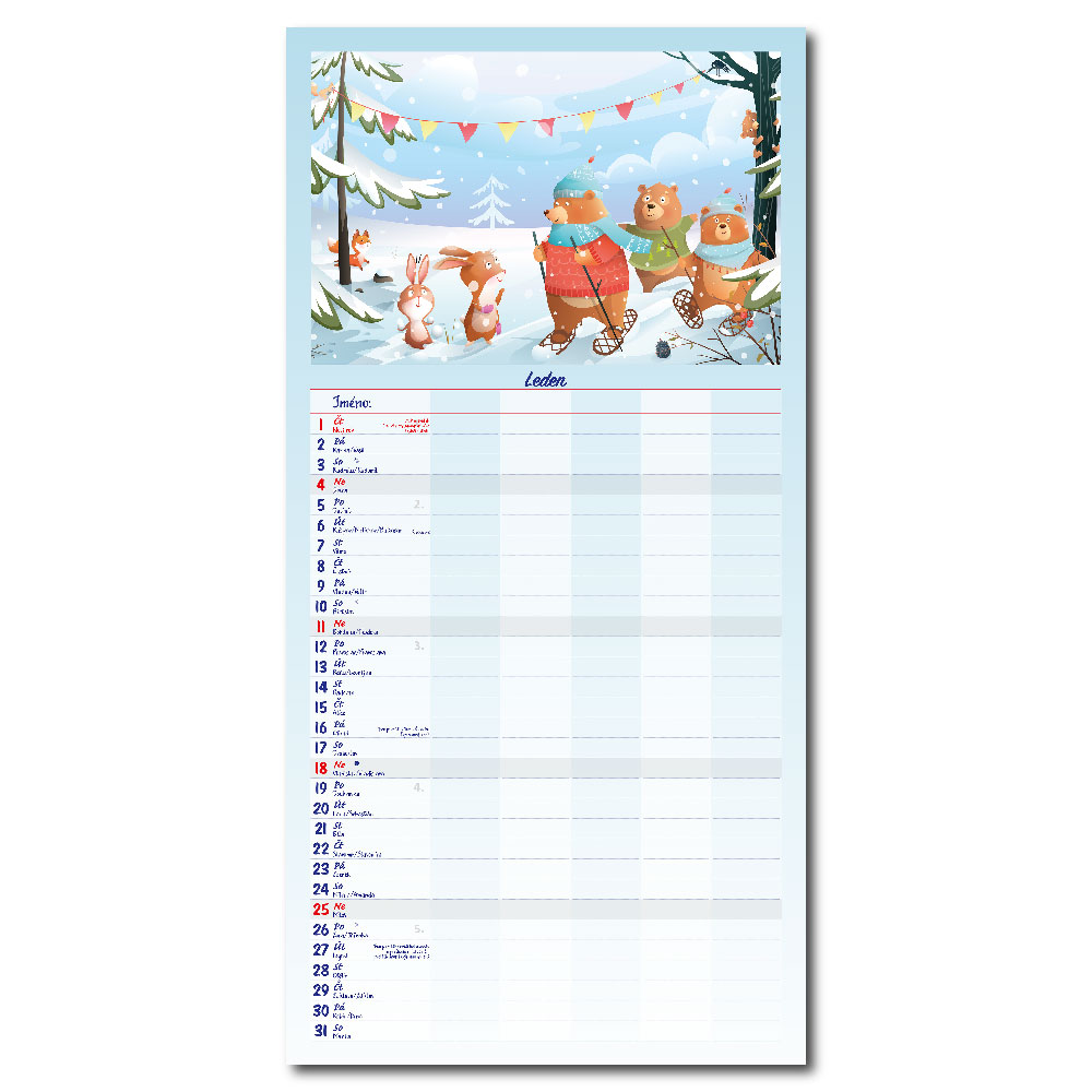 Rozměr: 31,5 x 63 cmKalendárium: české měsíční jmennéVazba: Twin wireRozsah kalendáře: 14 listů
