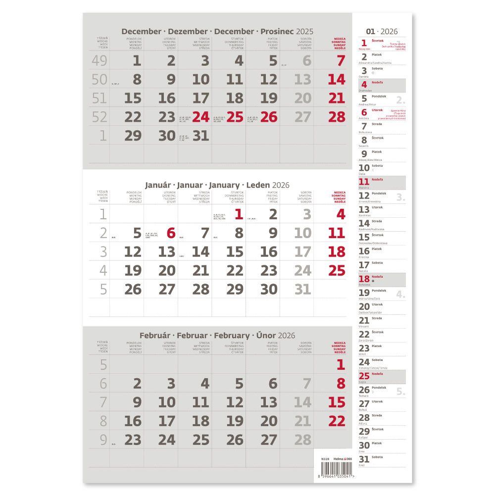 Rozměr: 31,5 x 45 cm Kalendárium: SK 3měsíční jmenné se svátky vybraných evropských států Rozsah kalendáře: 12 listů Plocha pro potisk: - 31,5 x 7 cm (spodní plocha) - 31,5 x 18 cm (horní plocha)