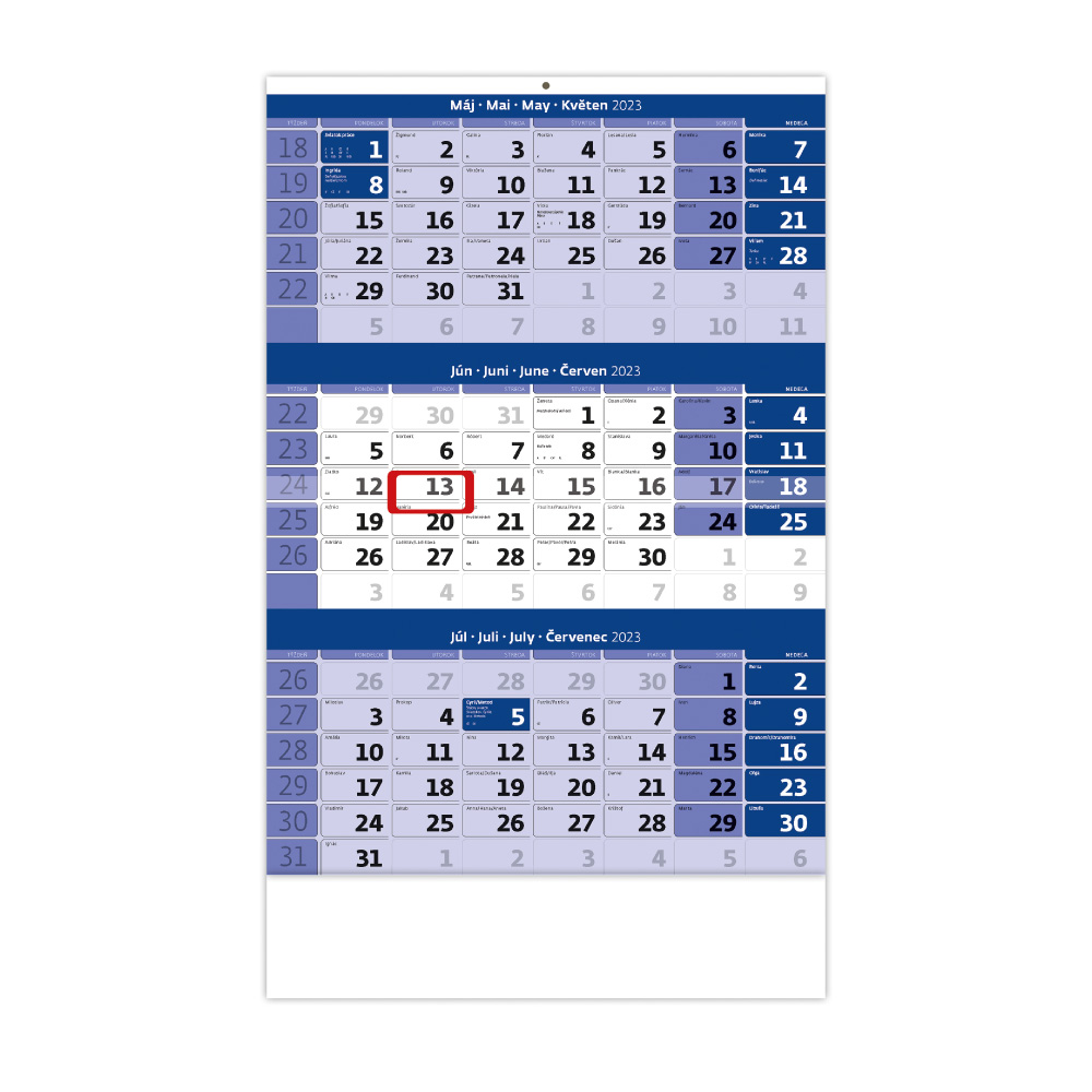 Rozměr: 31,5 x 45 cm Kalendárium: slovenské tříměsíční jmenné se svátky vybraných evropských států Rozsah kalendáře: 12 listů Plocha pro potisk horní laše: 31,5 x 18 cm Plocha pro potisk: 31,5 x 7 cm