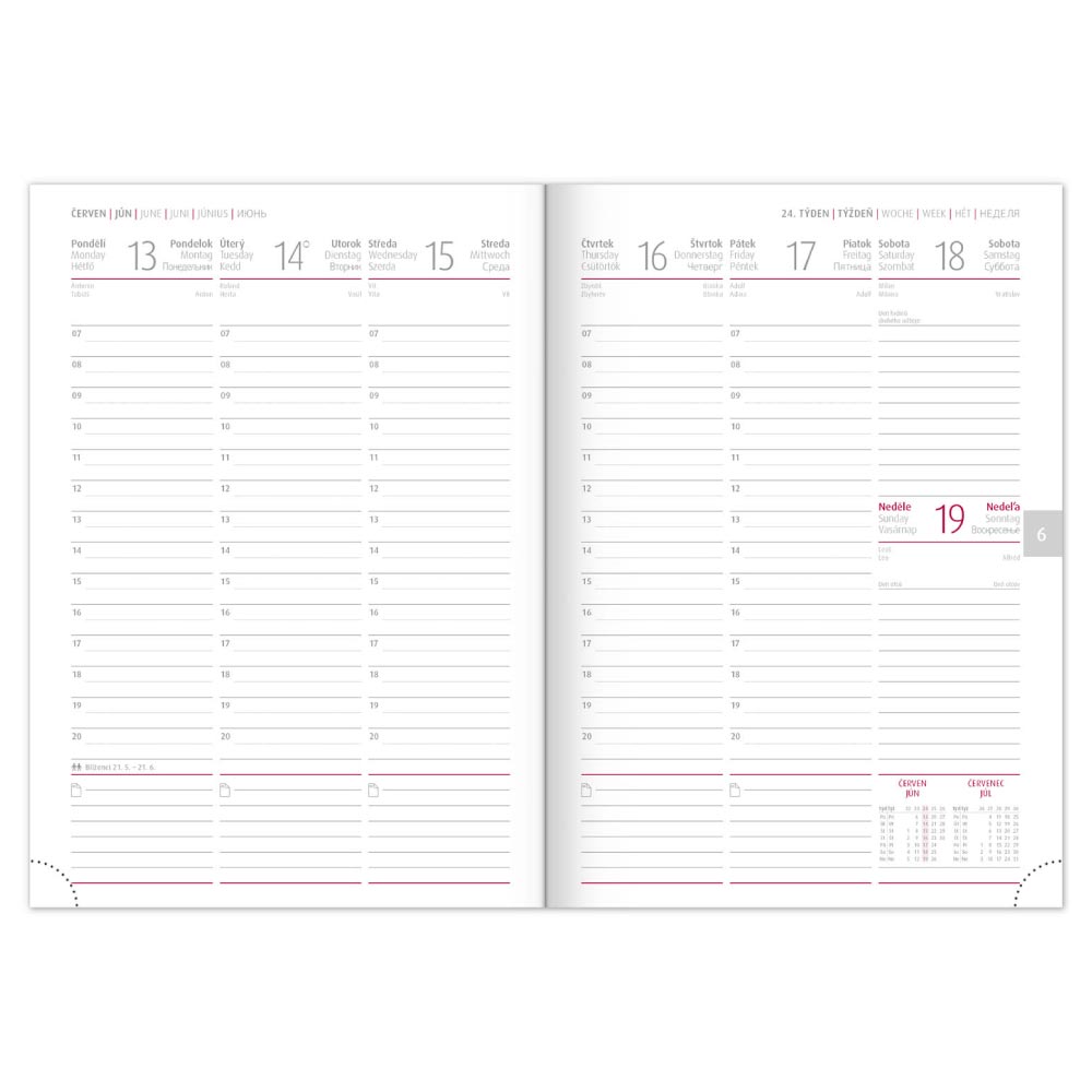 Diář obsahuje: místo pro osobní údaje, měsíční plánování 2022 a 2023,