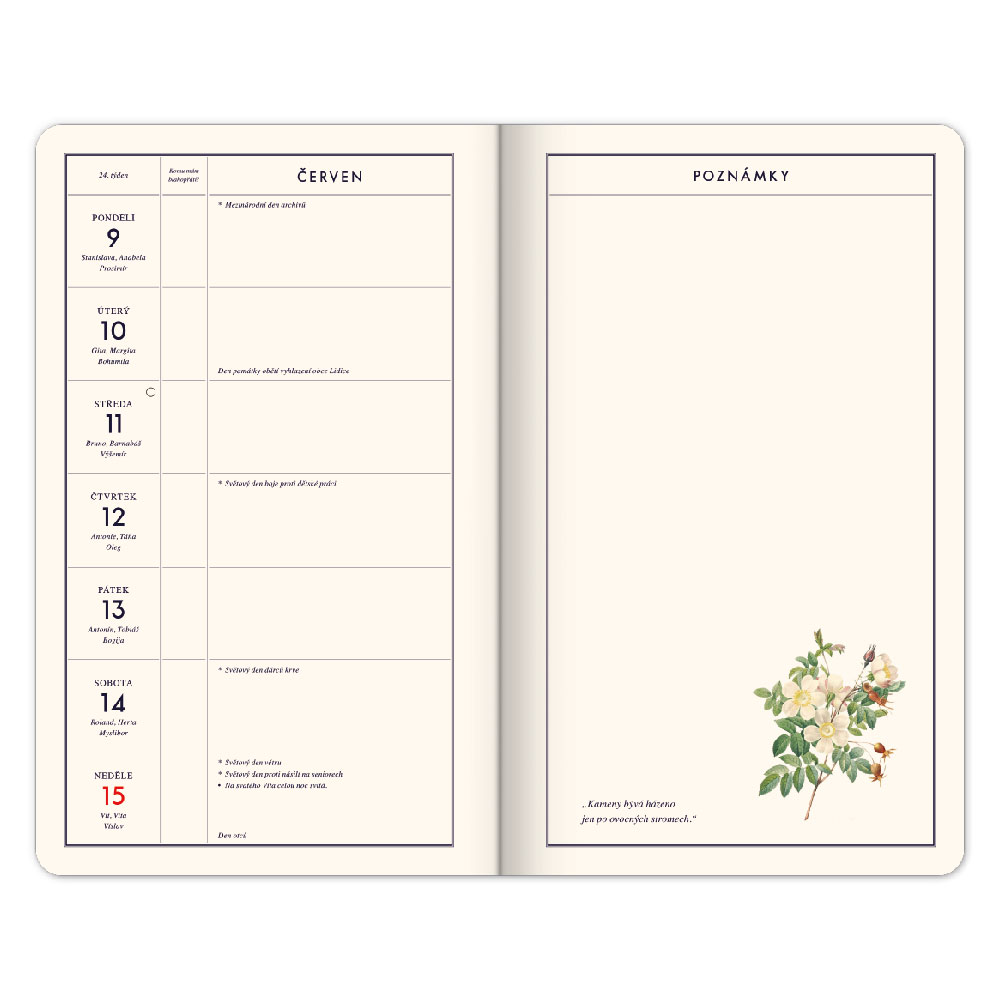 Rozměr: 13 x 21 cm Formát: A5 Kalendárium: české týdenní Počet stran: 192 stran Papír: 115 g/m2 krémový munken papír Vazba: tuhá knižní s uzavíráním na gumičku poutko na tužku