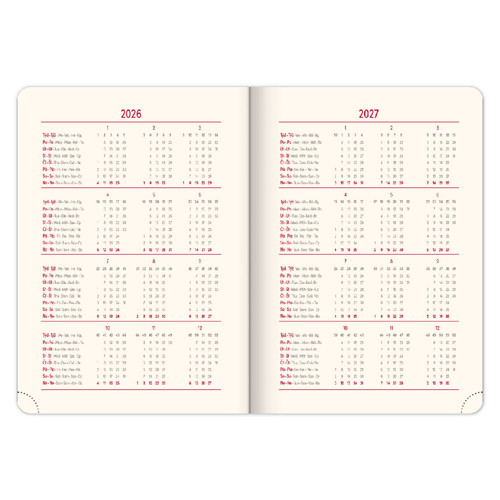 Diář obsahuje: místo pro osobní údaje, měsíční plánování 2026 a 2027,