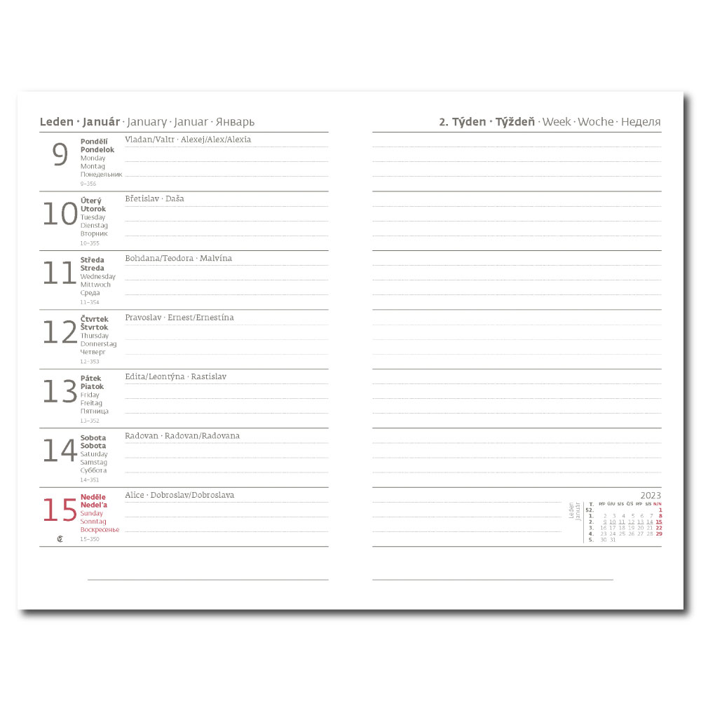 mezinárodní svátky, roční výhled, týdenní layout, adresář,