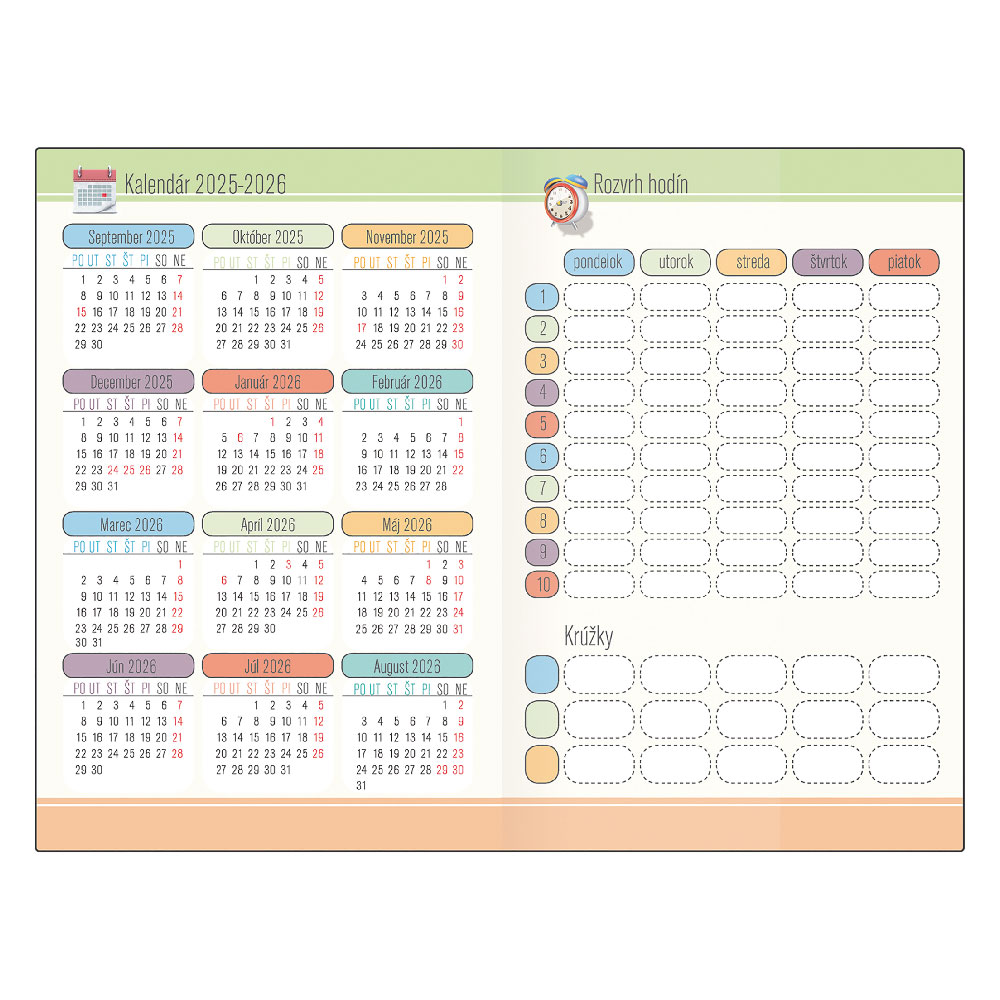 Obsahuje: rozvrh hodin, adresář, přehled prázdnin, poznámky,