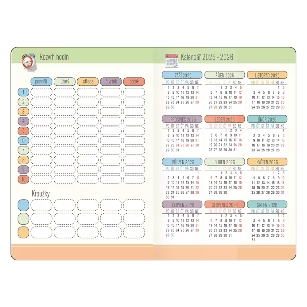 Obsahuje: rozvrh hodin, adresář, přehled prázdnin, poznámky,