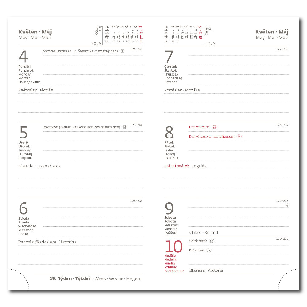 mezinárodní svátky, roční výhled, týdenní layout, adresář.