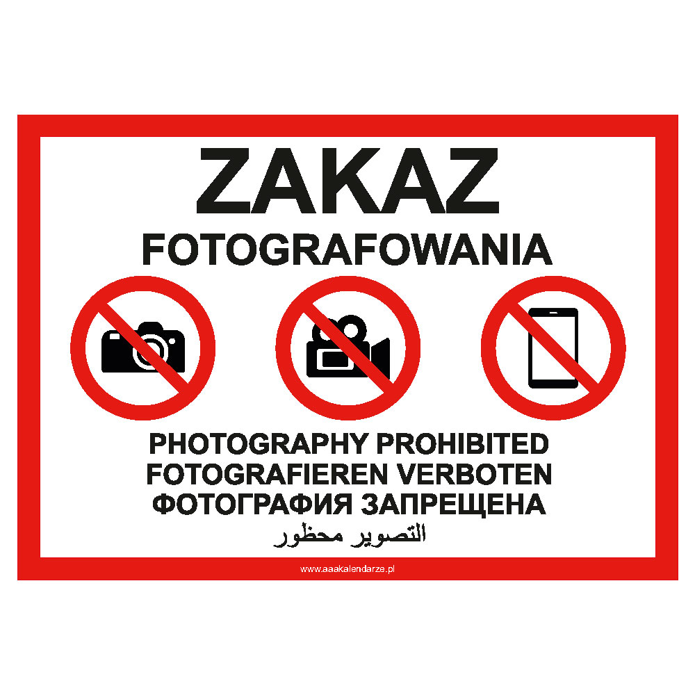 | Zakaz fotografowania - Znak BHP, naklejka A4 | RBT-SA4-1204-PL | Aufkleber | A4 (cca 210x297mm) | 0.70 | 0.85 |